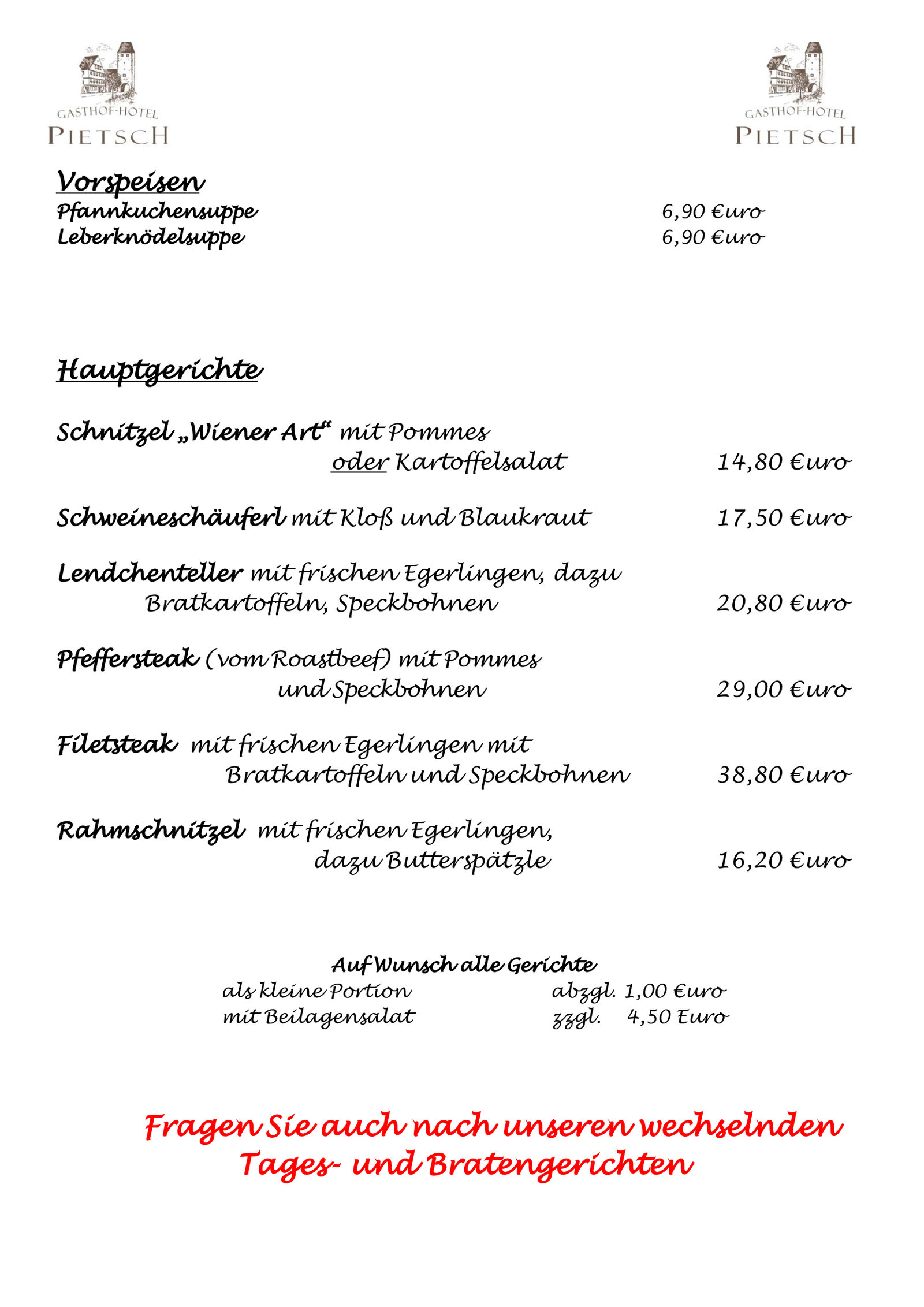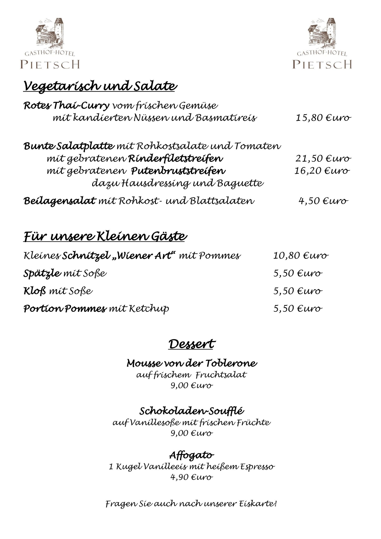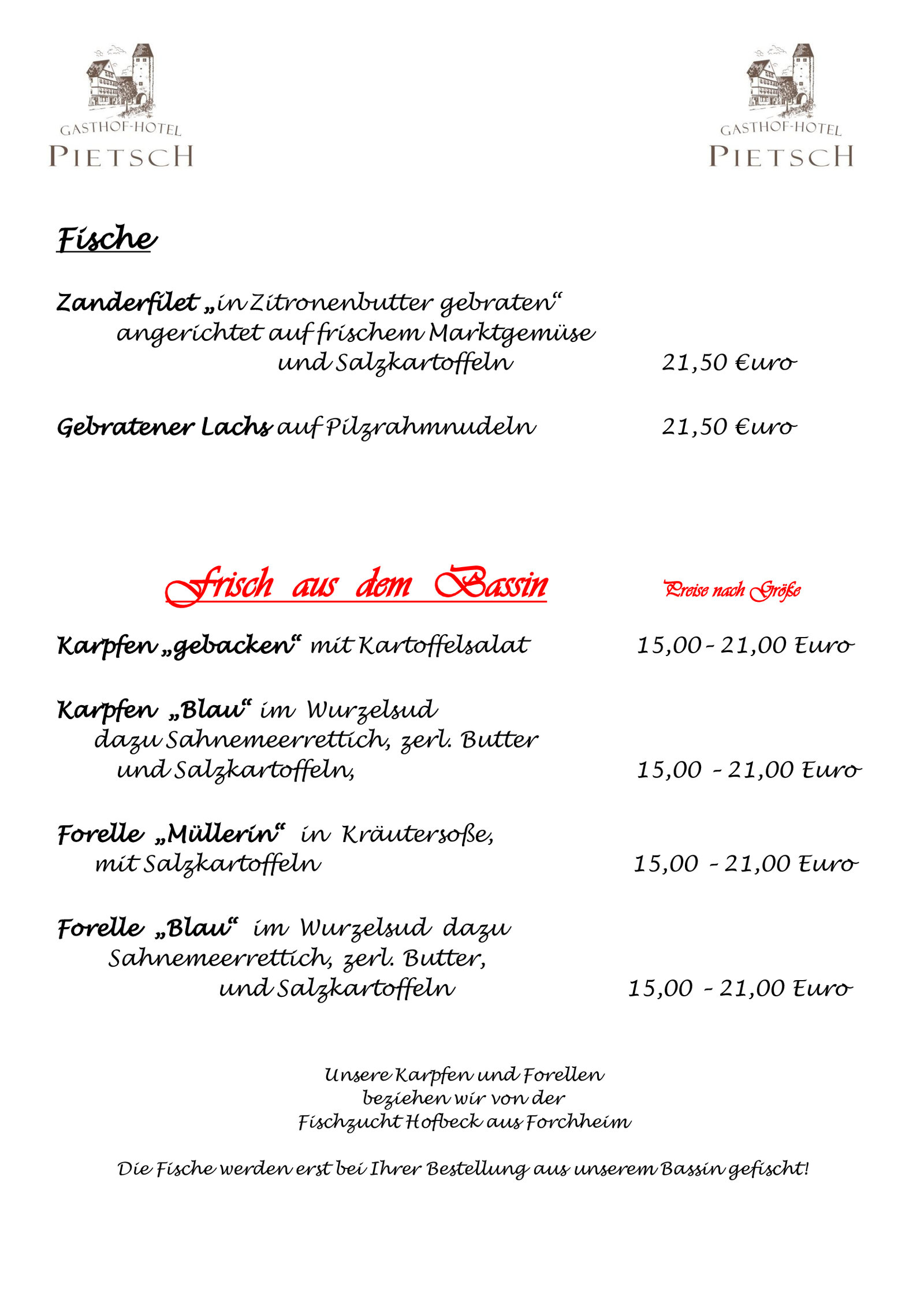 Die traditionsreiche Spezialitätenküche des Hauses Pietsch lädt zu einer kulinarischen Erlebnisreise ein. Ob Spargel aus heimischer Region, frischer Fisch aus dem Bassin, ofenfrischer Schweinebraten und Rehrücken mit Pfifferlingen oder Steinpilzen aus heimischen Wäldern - stets ist für feine Abwechslung gesorgt.